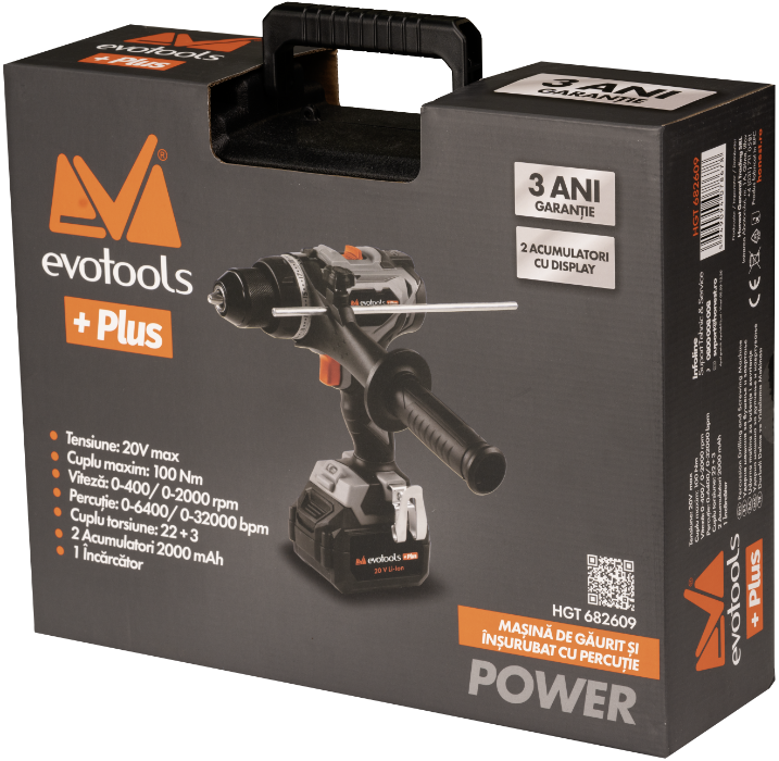 Description:Brushless Hammer Drill Driver with 2 Batteries and Charger MAX 20V POWER EvoTools +Plus®.
