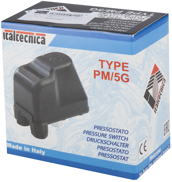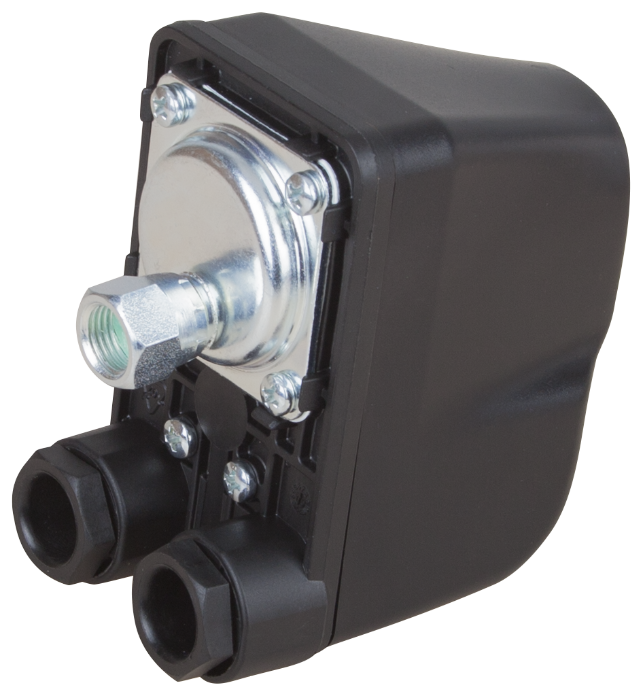 Pressure switch that automatically starts and stops the electric pump according to the set pressure values. The pressure switch can be used in fire-fighting systems and for pumps in water supply systems. The electrical contacts are normally closed and are made of brass alloy with an Ag-Ni surface. Adjustment range: 1-5 bar. Protection rating IP 44.